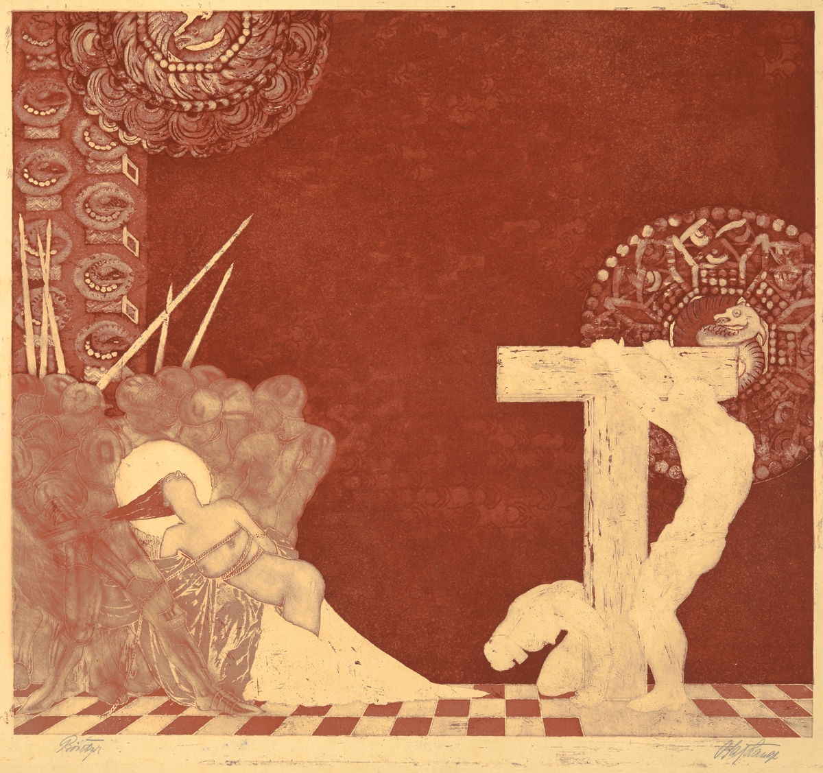 | Materiale og teknikk: | Fargeradering, prøvetrykk (mørkerød) |