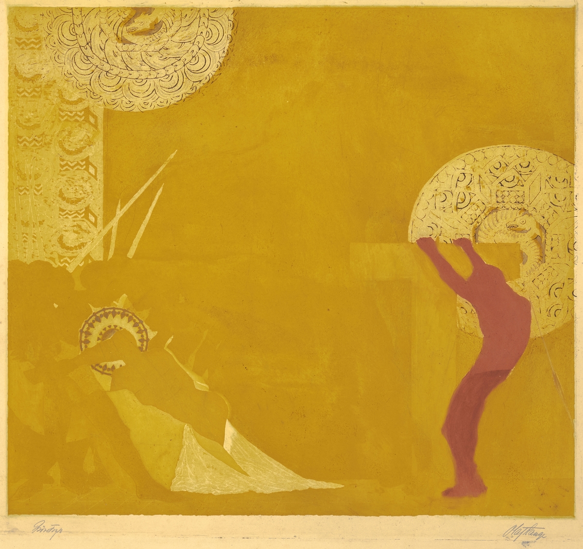 | Materiale og teknikk: | Fargeradering, prøvetrykk (oker og rød) |