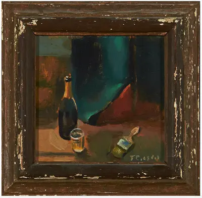 Stilleben med pensel-glass og flaske |